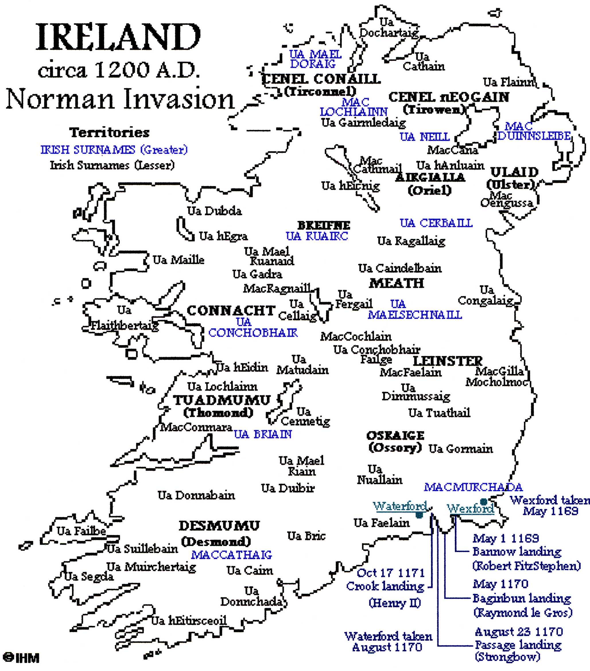 STRONGBOWhttps://fr.wikipedia.org/wiki/Richard_FitzGilbert_de_ClareWALSH BACKOocities = Site SourcePage 2 Comme indiqué dans la note 10, Kerviler lui donne pour prénom Eudes, parfois appelé Guillaume. Il en est de même pour Potier de Courcy. Pour Moreri, ce serait un Étienne. Il s'agit de Guillaume, fils d' Yrfroy et frère d'Hervé qui figure dans les Preuves de Dom Lobineau (p. 226, Guillemus Irfroii filius Hervei autem frater, iturus Jerusalem, ...). Addendum Guy Goion, seigneur de la Gouyonnière (La Gouesnière) aurait été présent à la reconstruction (1170-1187) de l'église du prieuré de Saint Magloir de Léhon (fondée au IXe siècle près de Dinan) qui passera en 1182 sous l'autorité de l'abbaye de Marmoutier. Pages 4-7 A propos d'Adam de Hereford et de dameta Goion. Le vieux château de Leixlip, près de Dublin, construit par l'époux de dameta Goion et où elle vécut avec lui, passa ensuite aux Pippard, la famille de leur gendre. Il fut attaqué pendant l'invasion (1315-1318) conduite par Robert Bruce, roi d'Écosse, et son frère Edward. Le donjon résista, mais Bruce laissa l'église en flammes. Leixlip passa ensuite aux FitzGerald qui le perdirent en 1534 après la rébellion de Silken Thomas FitzGerald, Xe comte de Kildare. Silken Thomas FitzGerald, fut détenu à la Tour de Londres et pendu, ses terres confisquées et tous les membres de la famille exécutés. Seul Gerald FitzGerald, un enfant de douze ans, put s'échapper et faire plus tard légitimer son titre par la reine Elisabeth I. Une partie de ses terres fut restituée en 1554. Tous ces Français se mariaient entre eux et sont devenus des Sean Ghalls (New Irish, nouveaux Irlandais) tenant tout le comté, une part de Meath, Dublin et Carlow avec des châteaux forts sur toute la côte depuis Down jusqu'à Adare, près de Limerick. Quand prit fin le gouvernement dictatorial de Cromwell, Dublin se développa et devint la deuxième ville de l'empire. En 1569, le château de Leixlip fut octroyé à Nicholas Whyte, vice-président de la Cour de cassation, qui fut mis en prison après l'échec de la rébellion d'Owen Roe O'Neilland en 1640. Sir Nicholas, en partie blanchi, put y revenir et y rester jusqu'en 1654. En 1732 William Conolly, neveu du speaker du même nom, acheta le château. La même année le Dr. Arthur Price, archevêque de Cashel, donna deux cents livres aux Guinness, Richard et le jeune Arthur, pour établir une brasserie à Leixlip sur les rives de la Liffey. Plus tard, pour s'agrandir, les Guinness déménagèrent l'usine à Dublin , St James's Gate. Le château fut revendu en 1945 par les Conolly à William Kavanagh, un promoteur de Dublin, qui le céda en 1958 à son occupant actuel : Patrick-Desmond-Carl-Alexander Guinness. La famille Guinness revenait ainsi à ses sources. Le 30 juin 2006 le château de Leixlip fut le théâtre du plus impressionnant rassemblement de stars jamais vu en Irlande : c'était le mariage de la petite-fille et héritière, super et superbe mannequin de mode, Jasmine-Leonora Guinness avec le Gallois Gawain O'Dare Rainey, neveu du comte de Harlech. Strongbow |